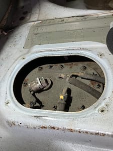 すると燃料ポンプが付いた上蓋が出てきます。ボルトもホースもコードが古く、ドキドキしながら壊すことのないように慎重に作業を進めます。