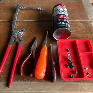 ラチェットレンチ、8ミリソケット、12ミリソケット(後部座席ボルト用)、シリコンスプレー、ペンチ、プラスドライバー等