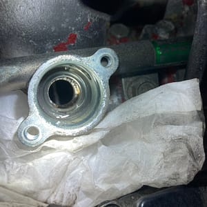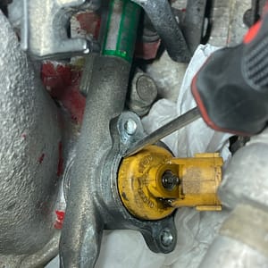 Next, I removed the cap holding the injector in place. The bolt has a positive lead, but I was worried it would strip, so I used an 8mm ratchet. Here too, I worked slowly, using silicone spray to avoid stripping the bolt.