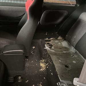 僕は、このWRXSTIは14年間放置していました。その間にWRXSTIはネズミの住処になっていました。そのせいで、WRXSTIの車内はかなりの汚れていました。今回はシートとカーペットを取り外しました。